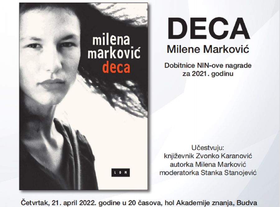 Roman u stihu “Deca” autorke Milene Marković, dobitnice NIN-ove nagrade za 2021. godinu biće predstavljen budvanskoj publici u četvrtak, 21. aprila u holu Akademije znanja sa početkom u 20 časova. O knjizi koju je objavila izdavačka kuća “Lom“ govoriće jedan od urednika izdanja, književnik Zvonko Karanović i autorka.